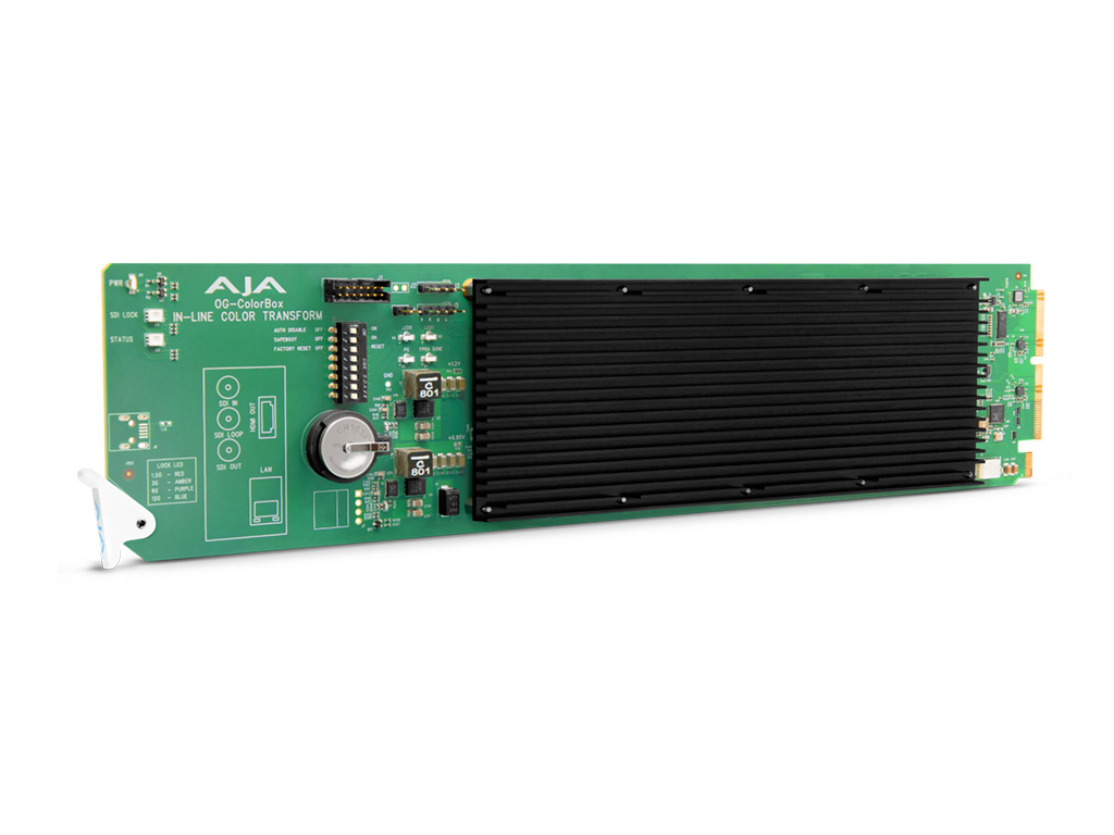 OG-ColorBox van AJA is een openGear-kaart voor kleurbeheer met hoge prestaties, speciaal ontworpen om te voldoen aan de behoeften op het gebied van kleurconversie en kleurcorrectie voor uitzendingen, live-evenementen en on-set-toepassingen. Het ondersteunt HDR-, SDR- en Wide Color Gamut (WCG)-signalen en maakt gebruik van 12G-SDI voor enkeldraads 4K/UltraHD tot 4:2:2 10-bit 60p of 4:4:4 12-bit 30p, met een unieke kleurverwerkingspijplijn en down-conversie. De ultralage latentie van de OG-ColorBox, minder dan ½ van een videolijn, maakt hem ideaal voor color managed workflows voor live producties.
