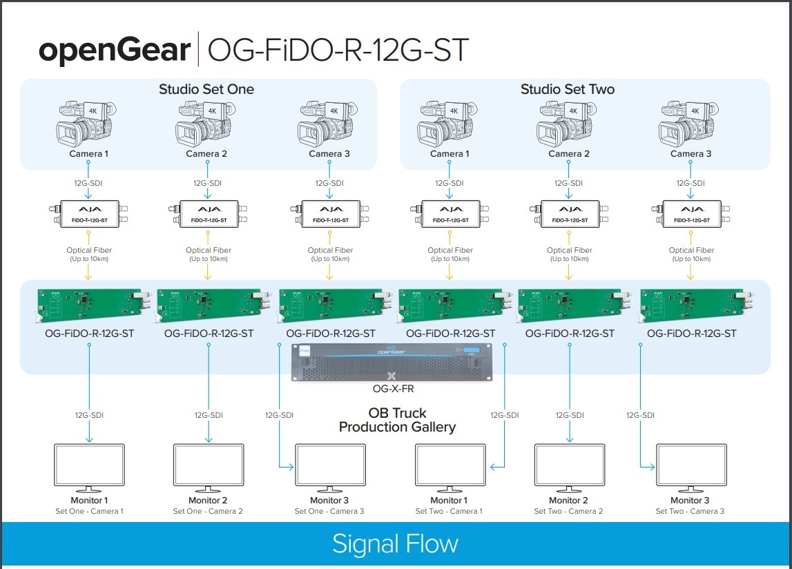Dit diagram toont zes openGear OG-FiDO-R-12G-ST kaarten die worden gebruikt in een OG-X-FR rackframe in de buurt van de productiegalerij, wat de hoge dichtheid van het openGear platform benadrukt. Deze zes openGear OG-FiDO-R-12G-ST kaarten zijn via glasvezellijnen verbonden met twee studiosets, die beide tot 10 km van de productiehal verwijderd kunnen zijn. De studiosets bevatten elk drie 12G-SDI camera's die zijn aangesloten op drie FiDO-T-12G-ST miniconverters, die de 12G-SDI naar glasvezel ST-conversie verzorgen. De productiegalerie ontvangt 6 afzonderlijke camerafeeds als 12G-SDI, via de OG-FiDO-R-12G-ST, die de videomonitoren van de galerie met ultralage latency aansturen.