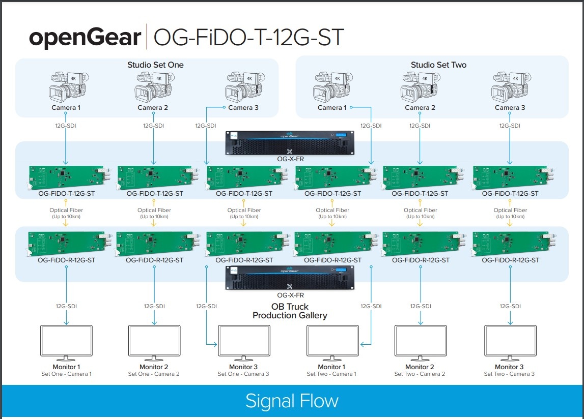 Dit diagram toont zes openGear OG-FiDO-T-12G-ST kaarten die worden gebruikt in een OG-X-FR rackframe, wat de hoge dichtheid van het openGear platform benadrukt. De studiosets bevatten elk in totaal zes 12G-SDI camera's die zijn aangesloten op zes OG-FiDO-T-12G-ST kaarten, die zorgen voor de conversie van 12G-SDI naar glasvezel ST. Fiberruns worden vervolgens verlengd tot 10 km naar een OB-productietruck met zes OG-FiDO-R-12G-ST kaarten in een OG-X-FR rackframe. De productieruimte ontvangt zes discrete camerafeeds als 12G-SDI via de OG-FiDO-R-12G-ST, die de videomonitoren van de ruimte met ultralage latency aansturen.