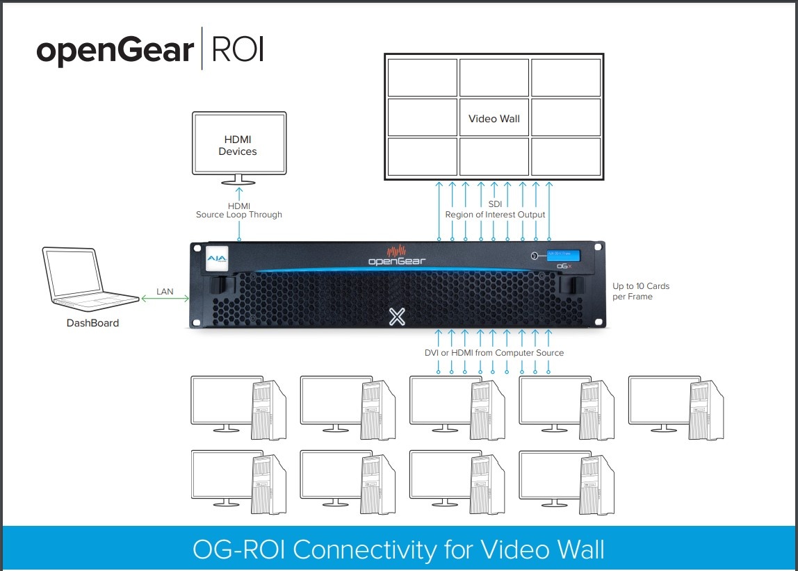 Het is ook mogelijk om de uitvoermogelijkheden uit te breiden en een grote, gesynchroniseerde videowall te creëren. Het workflow diagram toont 9 x OG-ROI-HDMI gebruikt in een rackframe om een videowall van 9 SDI monitoren te produceren. De besturing van elke OG-ROI-HDMI gebeurt via ethernet naar het DashBoard. Elke computerbron is aangesloten op een OG-ROI-HDMI ingang met het interessegebied als uitvoer via SDI. Eenvoudige bediening en connectiviteit voor de OG-ROI-HDMI kunnen worden gebruikt om geavanceerde en complexe videowandpresentaties te maken.