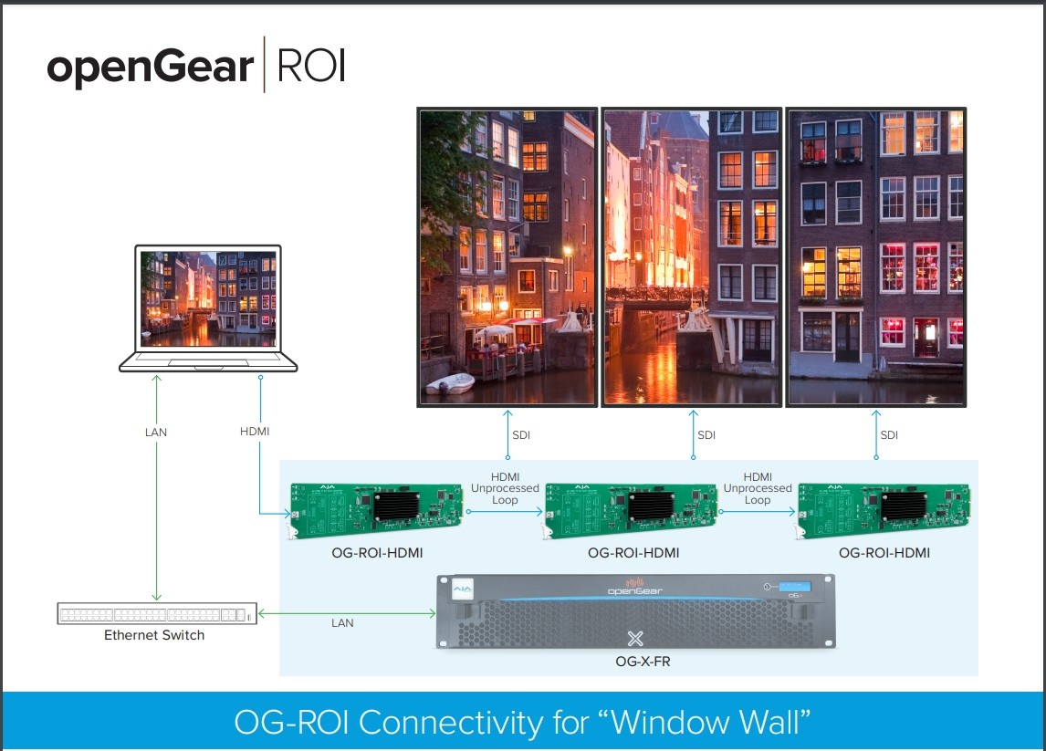 Je kunt eenvoudig zeer effectieve en boeiende displays maken door extra OG-ROI-HDMI openGear converters te gebruiken. Door gebruik te maken van drie OG-ROI-HDMI openGear converters in het juiste rackframe kun je drie beeldschermen naast elkaar voeden, elk gedraaid naar portretmodus. Door gebruik te maken van de HDMI-doorvoer van de OG-ROI-HDMI is het door HDMI gerouteerde beeld synchroon, terwijl elke OG-ROI-HDMI de nodige regio-uitvoer levert via SDI. Instellingen voor elk van de OG-ROI-HDMI openGear converters worden geleverd via ethernetbediening via een ethernetschakelaar. Het resultaat is een visueel opwindende en creatieve manier om weergave-inhoud te voeden.