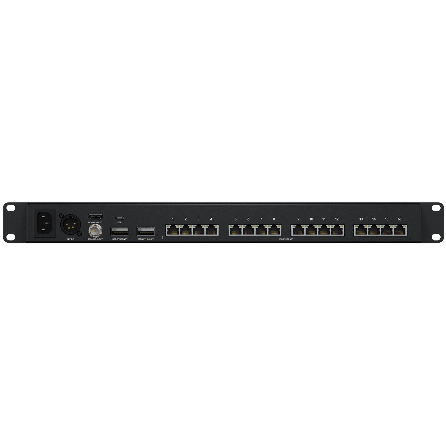 16 x 10Gb/s RJ‑45 connectors supporting 10/100/1000/10G BASE-T for SMPTE-2110 IP video in and out, configuration and firmware updates,