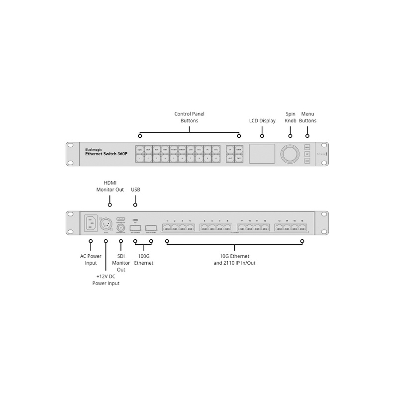 De Blackmagic Ethernet Switch 360P is de eerste Ethernet switch die speciaal is ontworpen voor de film- en televisie-industrie, Het is een high performance low latency Ethernet switch met 16 snelle 10G Ethernet en 2 high speed 100G Ethernet poorten, QSFP aansluiting voor high speed koperkabels of langere optische vezelkabels, Ethernet aansluitingen aan de achterzijde voor beter kabelbeheer en NMOS protocol voor 2110 IP video workflows,