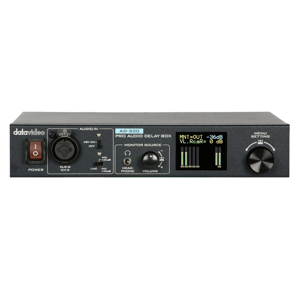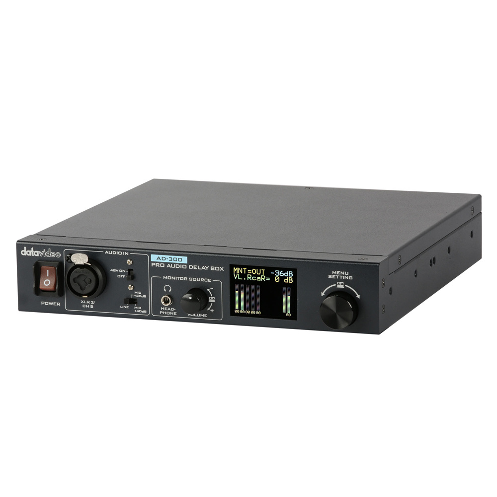 The AD-300 professional audio delay device has a 3000 ms audio delay range, and each input can be adjusted individually in milliseconds to achieve professional-grade sound and video synchronization. The built-in mix function allows you to select any of the five input sources that you want to mix and combine them into a single output channel. A Test Tone can be added for volume correction.