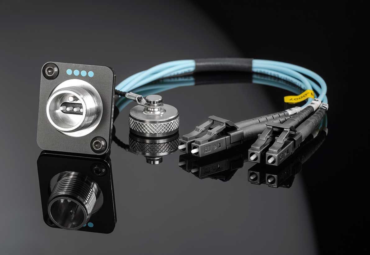 4Core connector for mounting in a chassis or 19 inch panel, with standard D-size form factor, that connects to your 4Core main cable. At the back it sports a 0.5 meter fanout with LC Duplex connector.