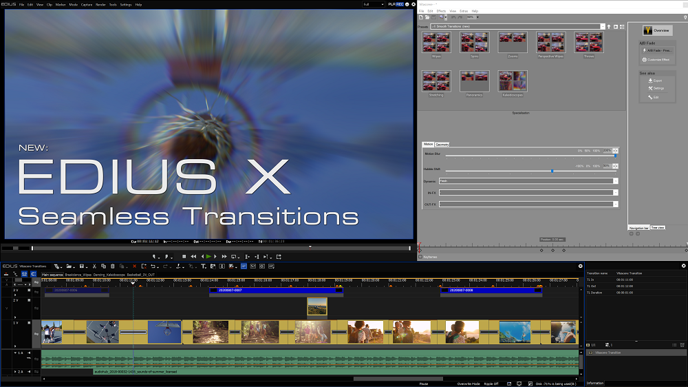 - Video Effecten & Naadloze Overgangen: EDIUS X is voorzien van proDAD Vitascene V4 EDIUS Edition met meer dan 100 naadloze overgangen. Alle voorinstellingen kunnen worden aangepast aan het individuele beeldmateriaal van de gebruiker. De naadloze overgangen werken ook geweldig bij het animeren van titels en afbeeldingen. Bovendien bevat proDAD Vitascene V4 EDIUS Edition meer dan 250 geweldige filters en overgangen van Vitascene 3 LE.