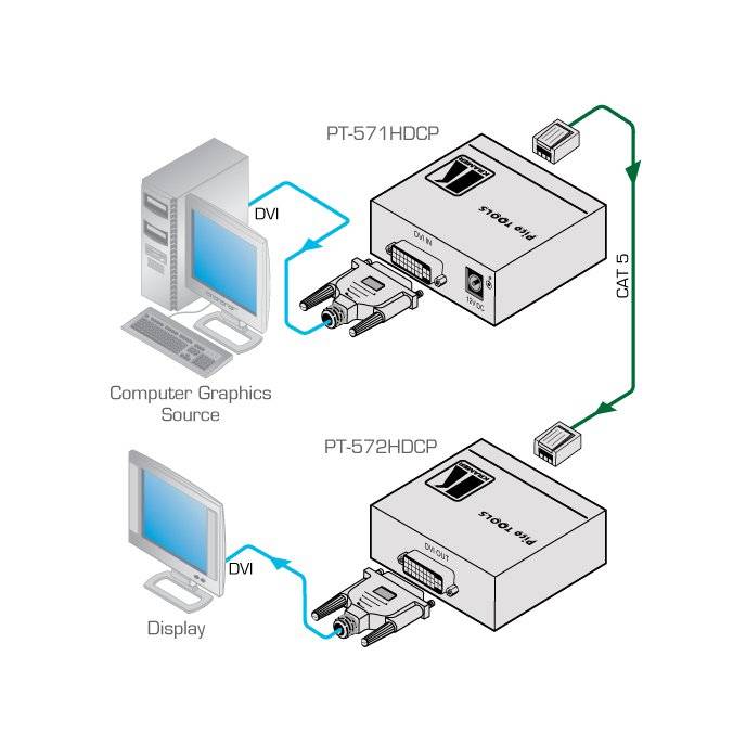 The PT−572HDCP+ is a DGKat™ twisted−pair receiver for DVI signals. The PT−571HDCP converts the DVI to twisted pair signal and the PT−572HDCP+ converts the twisted pair signal back to a DVI signal. The PT−572HDCP+−MD is certified for medical applications.