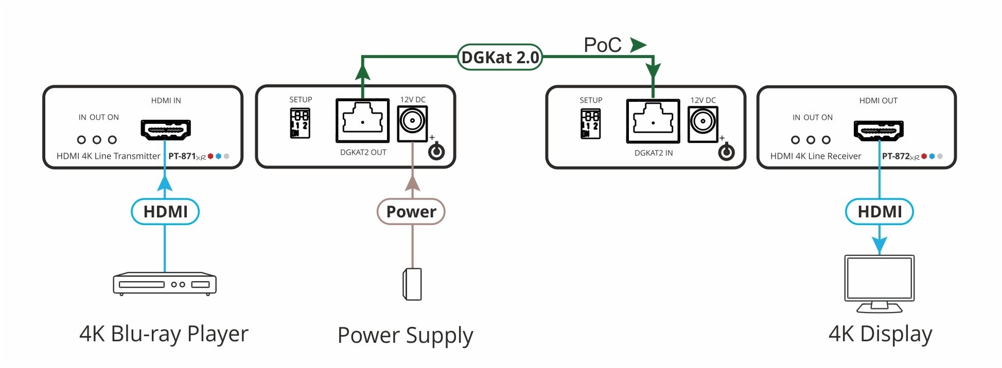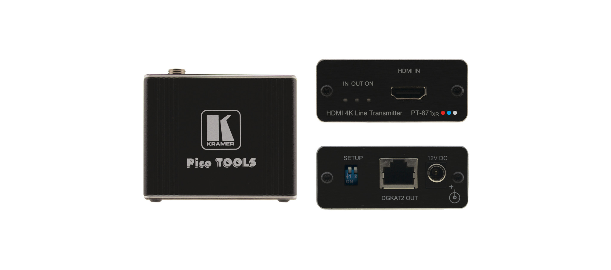 - High Performance Extender — Professional DGKat™ 2.0 transmitter for providing long–reach signals and 2–way power over twisted pair copper infrastructures. PT–871xr employs low–level video compression technology that delivers visually lossless performance for 4K@60Hz (4:4:4) HDR signals with near–zero latency.