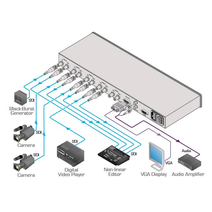 - 4 SD/HD–SDI, 1 genlock 75Ω on BNC connectors, 1 VGA/UXGA port on a 15–pin HD connector (YUV/RGB selectable)