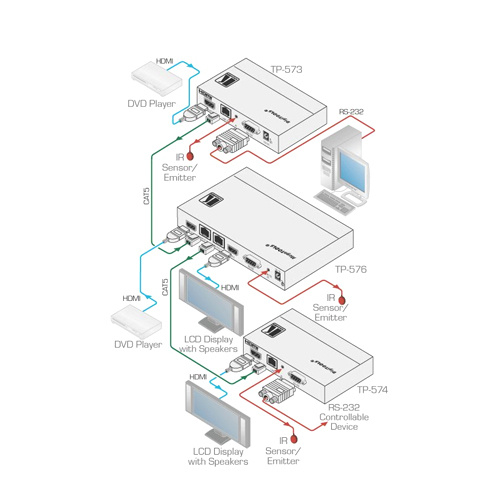 De Kramer TP-574 is een DGKat twisted pair ontvanger voor HDMI, bidirectionele RS-232 en infraroodsignalen. De TP-573 converteert de ingangssignalen naar een twisted pair signaal en de TP-574 converteert het terug naar HDMI, RS-232 en infraroodsignalen.