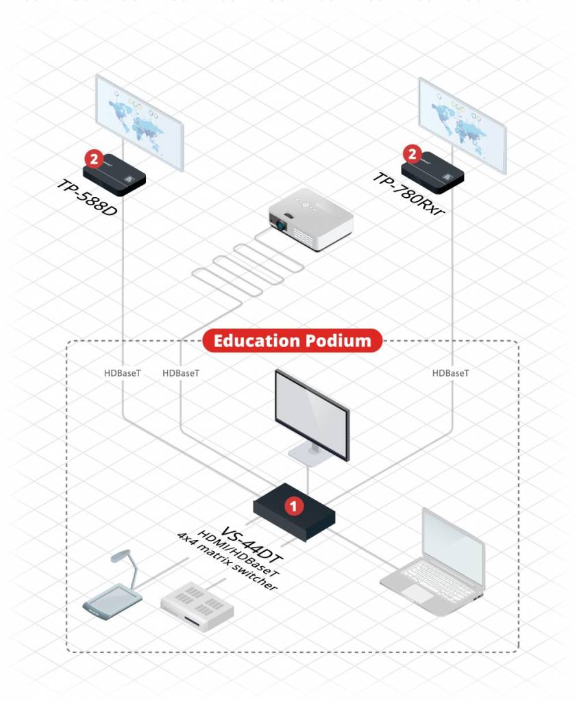 - Long–distance AV and LAN signal extension for multi–room, large dividable auditoriums and lecture hall connectivity