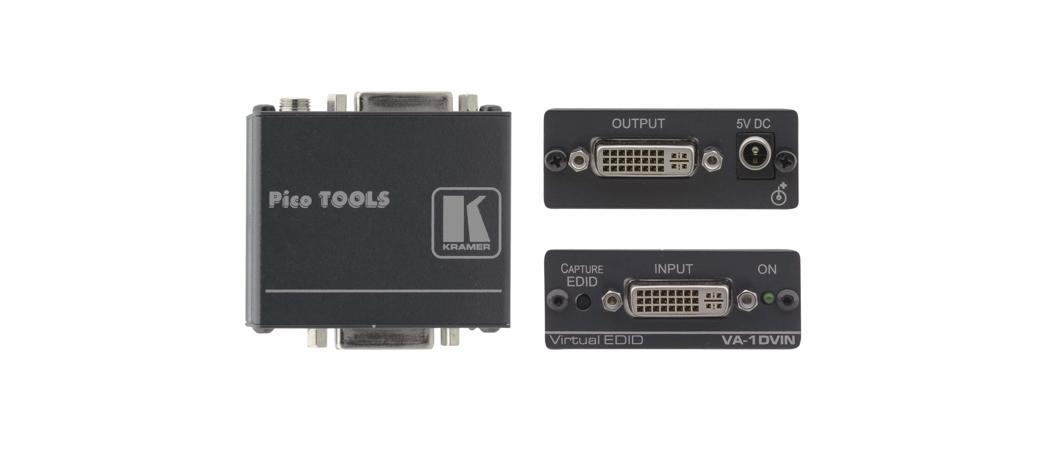 The VA−1DVIN is an EDID emulator for DVI−D signals. The unit can capture an EDID setting in non−volatile memory from the output allowing convenient and reliable connection to the source.