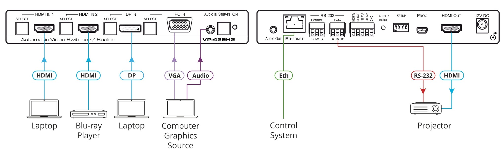 VP−429H2 is a 4K@60Hz (4:4:4) scaler / switcher tool for HDMI, DisplayPort, VGA, and unbalanced audio signals. The unit scales the signal and outputs it on HDMI. Step−In functionality provides easy plug−and−play collaboration when connected to a switcher that supports Step−in over HDMI. It also features convenient RS−232 control of monitor or projector activation and supports Ethernet, contact closure switches and RS−232 control.