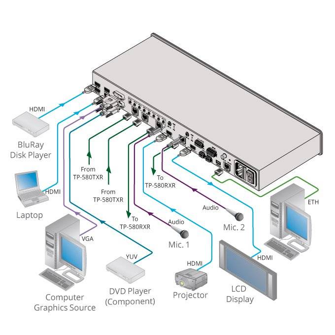 - Inputs — Choice of HDMI, VGA, YUV, or CV on two DVI–U inputs, 4 HDMI and 2 HDBaseT inputs.