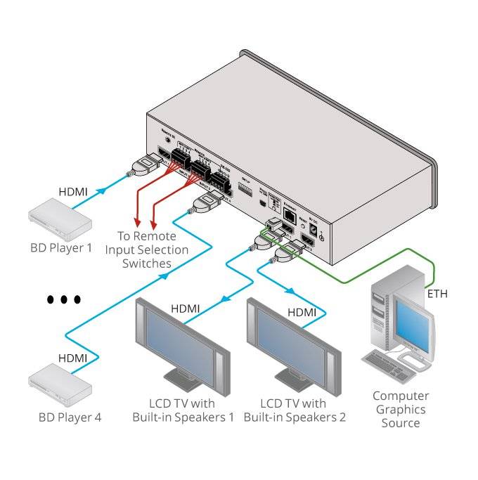 - EDID Pass–through — Pass–through algorithm ensures Plug and Play operation for HDMI source and display systems.