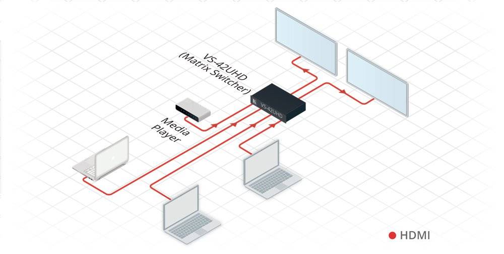 VS−42UHD is a high−quality, 4x2 matrix switcher for 4K@60Hz (4:2:0) HDMI signals. It reclocks and equalizes the signals and can route any input to either or both outputs simultaneously.