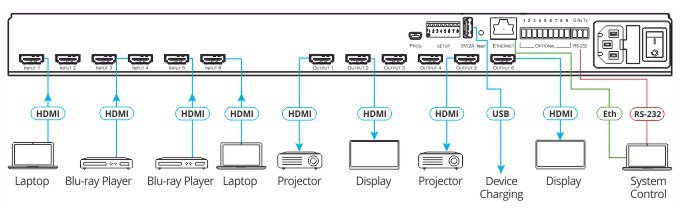 VS−66UHD is a high−quality 6x6 matrix switcher for 4K@60Hz (4:2:0) HDMI signals and embedded audio. It reclocks and equalizes the signals and can route any one of six HDMI, HDCP−compliant sources (selectable) to any or all outputs simultaneously. VS−66UHD offers a flexible audio scheme where any HDMI digital audio input can be routed to any HDMI digital audio output in addition to ARC support to produce an equivalent 12x9 audio matrix.