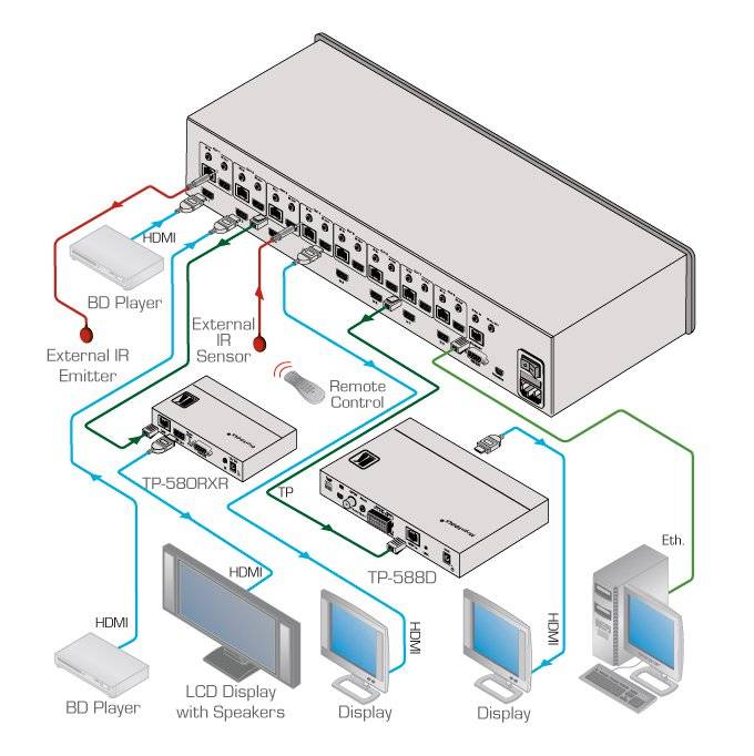 The VS−88DT matrix switcher routes up to eight HDMI and IR inputs to any or all of eight HDMI or HDBaseT and IR outputs for connection to compatible HDBaseT receivers such as the TP−580RXR.