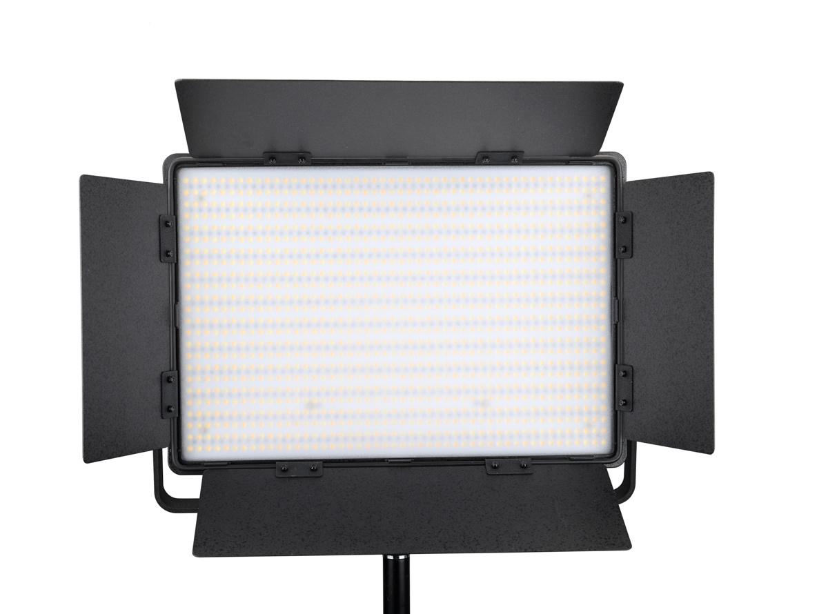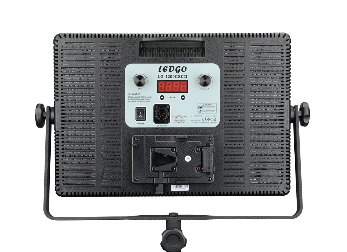 The Broadcast Series Bi-Color LED Panel 1200 with DMX & WiFi from Ledgo comes with Broadcast series bi-color LED panel 1200, a set of removable barndoors, a built-in Sony V-lock battery plate, a yoke with 5/8" light stand mount, three filter sets, and a nylon carry case.