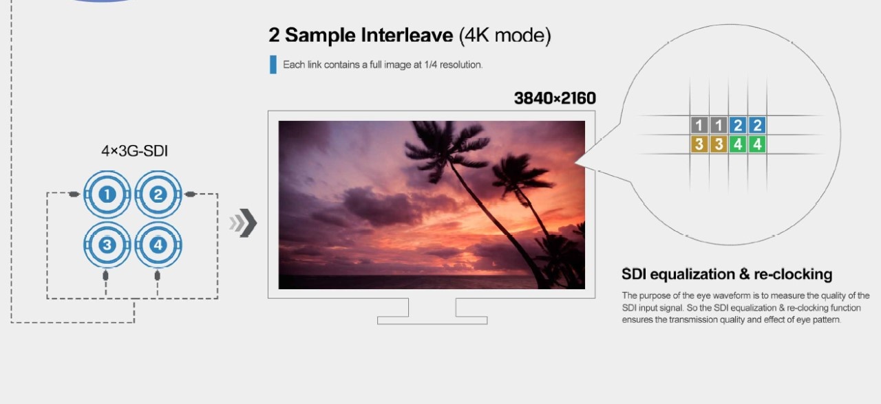 COMPATIBEL MET DUAL CHANNEL (3G/6G) EN QUAD CHANNEL (3G) ALS MET SINGLE CHANNEL HD-SDI, 3G-SDI, 6G-SDI en 12G-SDI.