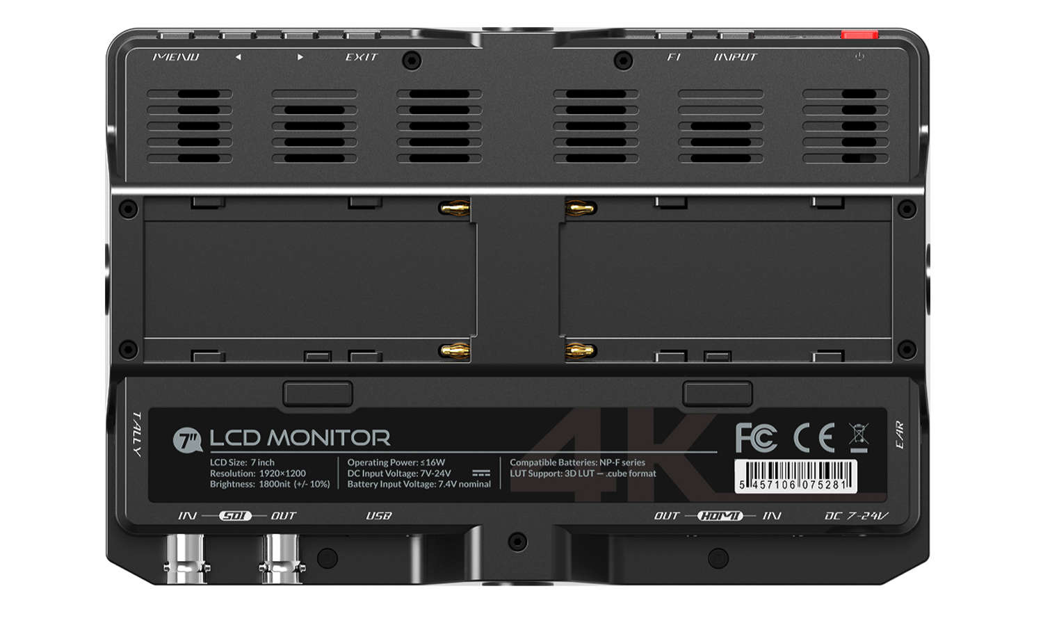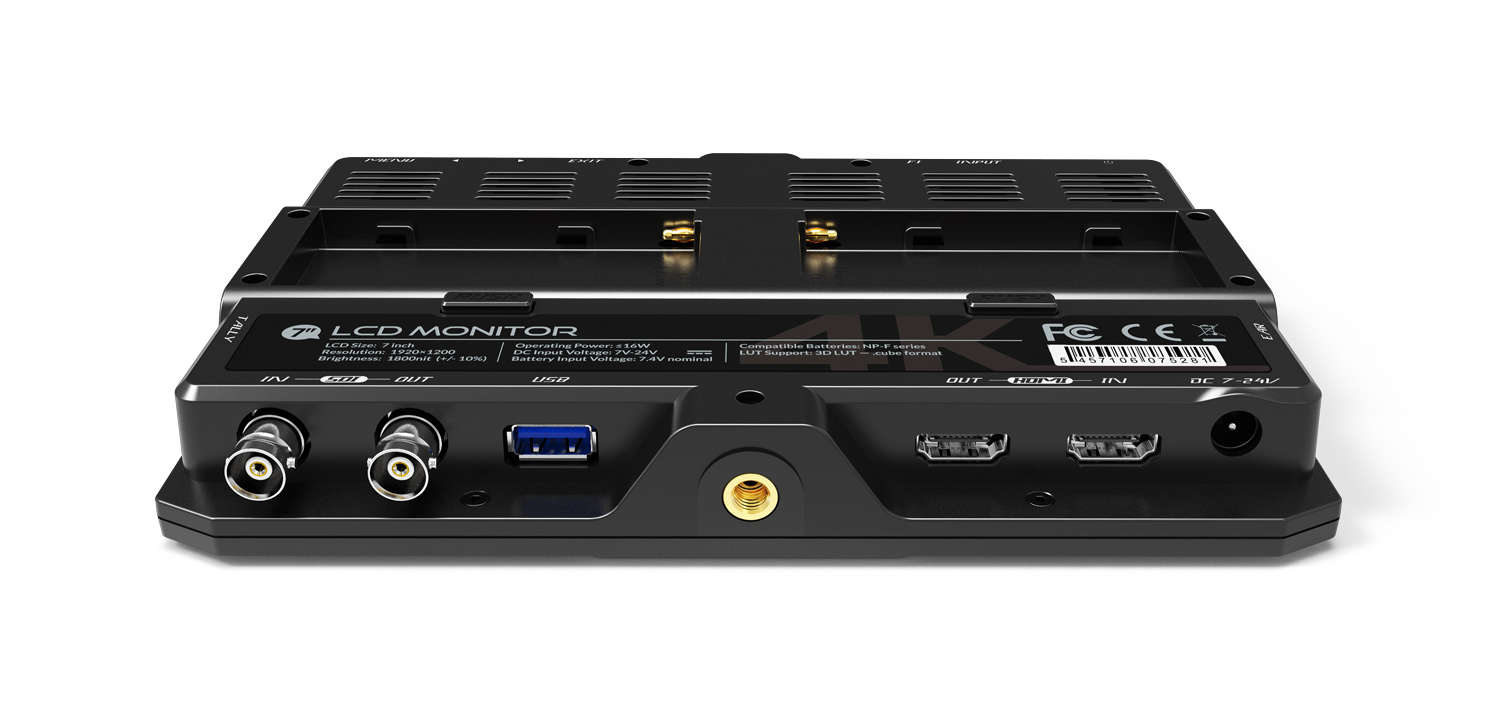 De H7S ondersteunt het laden van 3D LUT's via de USB-poort aan de onderkant en ondersteunt HDR-beeldinvoer met de mogelijkheid om een breed dynamisch bereik weer te geven, zoals ST2084-300, ST2084-1000, ST2084-10000 en HLG (Hybrid Log Gamma). Aan de achterkant van de monitor bevindt zich een dubbele L-serie batterijplaat, zodat u de monitor van stroom kunt voorzien voor een lange opname. De batterijen zijn ook hot-swappable, zodat u de ene batterij kunt opladen en de andere kunt verwisselen terwijl de monitor in gebruik is, zonder dat u deze hoeft uit te schakelen.