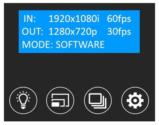 LCD-scherm geeft framesnelheden, invoer- en uitvoerresoluties en modusselectie weer