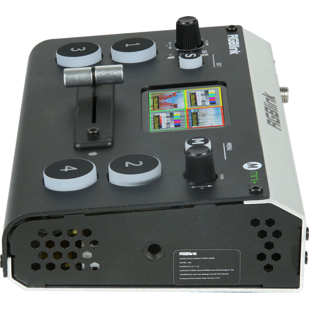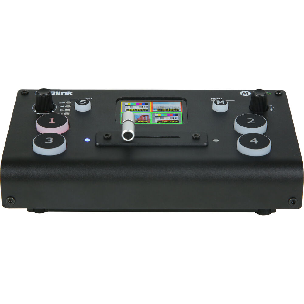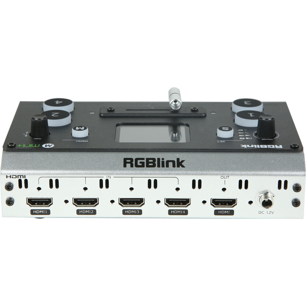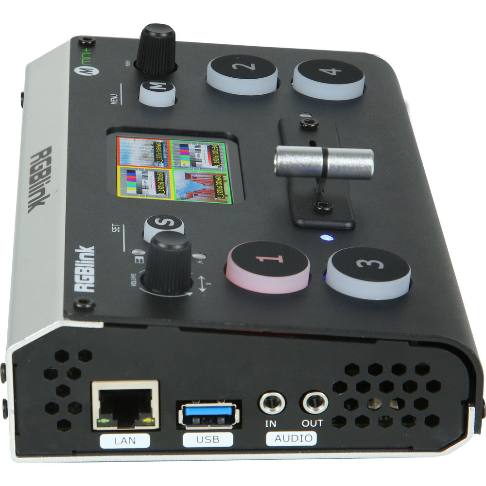 Live-switch, control, and stream up to four HDMI video sources such as PTZ cameras with transitions and effects using the mini+ Video Switcher from RGBlink. The compact mini+ video switcher can switch up to four HDMI inputs, output program and preview video via one HDMI port, and stream up to 1080p60 H.265 video via USB with third-party streaming software. The advantage of the mini+ over the mini model is that the mini+ allows you to control PTZ cameras, and it supports the use of chroma keying and the addition of graphics logos to your video feed.