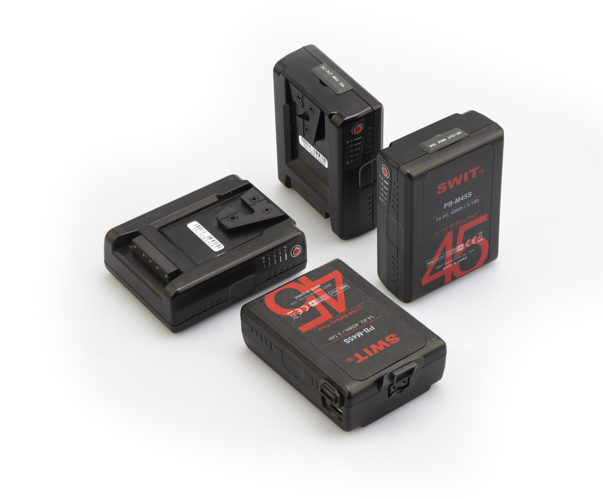 The pocket size PB-M45S still has D-tap and USB sockets built-in. The D-tap socket share 100W/8A load DC output with the V-mount pins, and support charging input by SWIT PC-U130B2 dual D-tap charger.