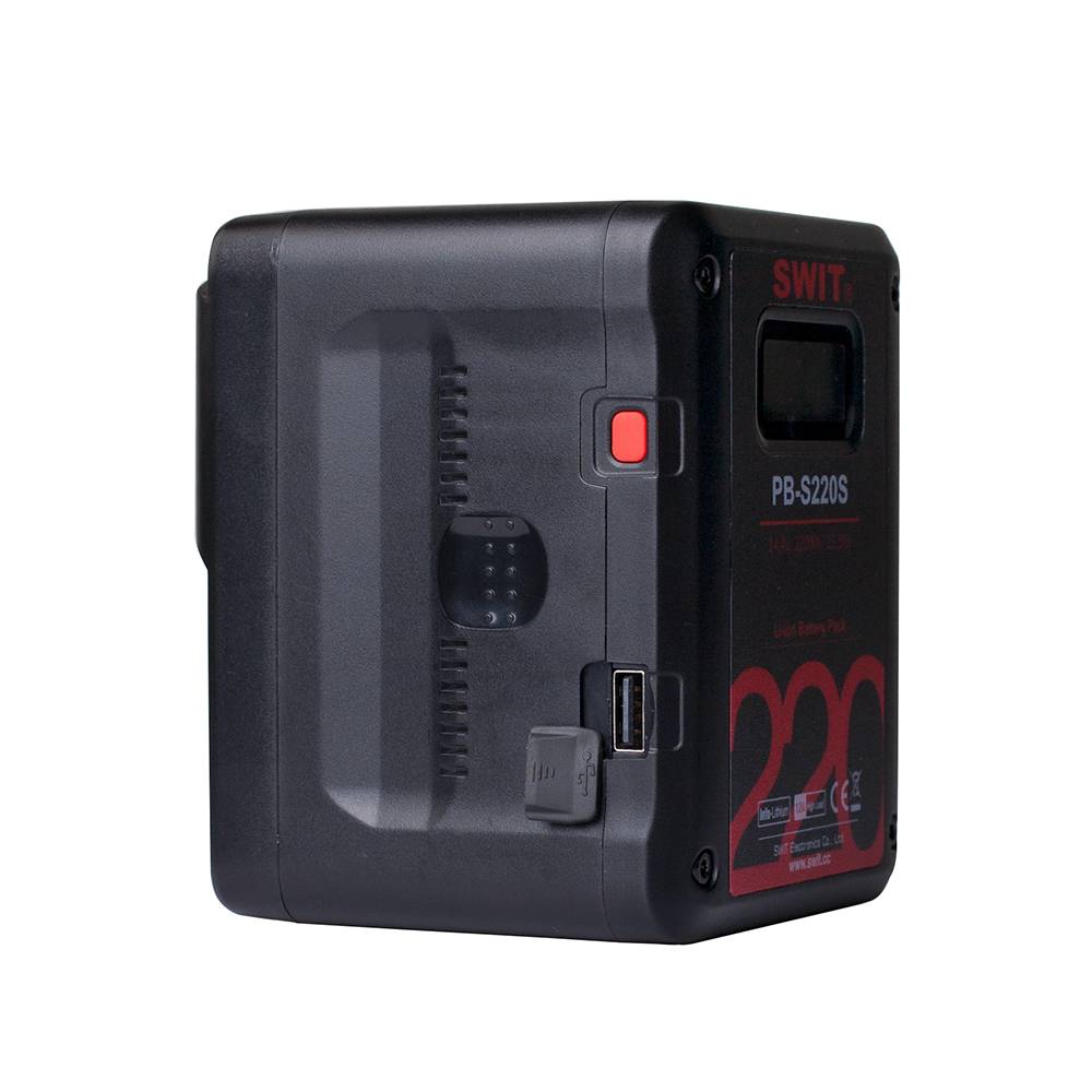 The SWIT PB-S220S 14.4V 220Wh Multi D-Tap Heavy-Duty Digital Battery, featuring a V-mount, has a short, square-shaped design and provides up to 150W/12A continuous output. This makes it suitable for up to the most demanding cine-cameras along with monitors and other accessories. With 220 watt hours, the PB-S220S delivers approximately 2.5 hours of power to the ARRI ALEXA and 7 hours to ENG cameras. In addition to this, it offers four D-Tap outputs — meaning you won't need splitters if you have multiple accessories to power — and a USB port for charging mobile devices.