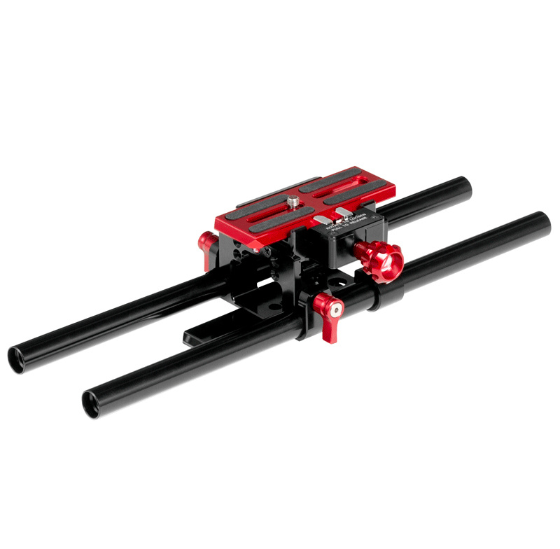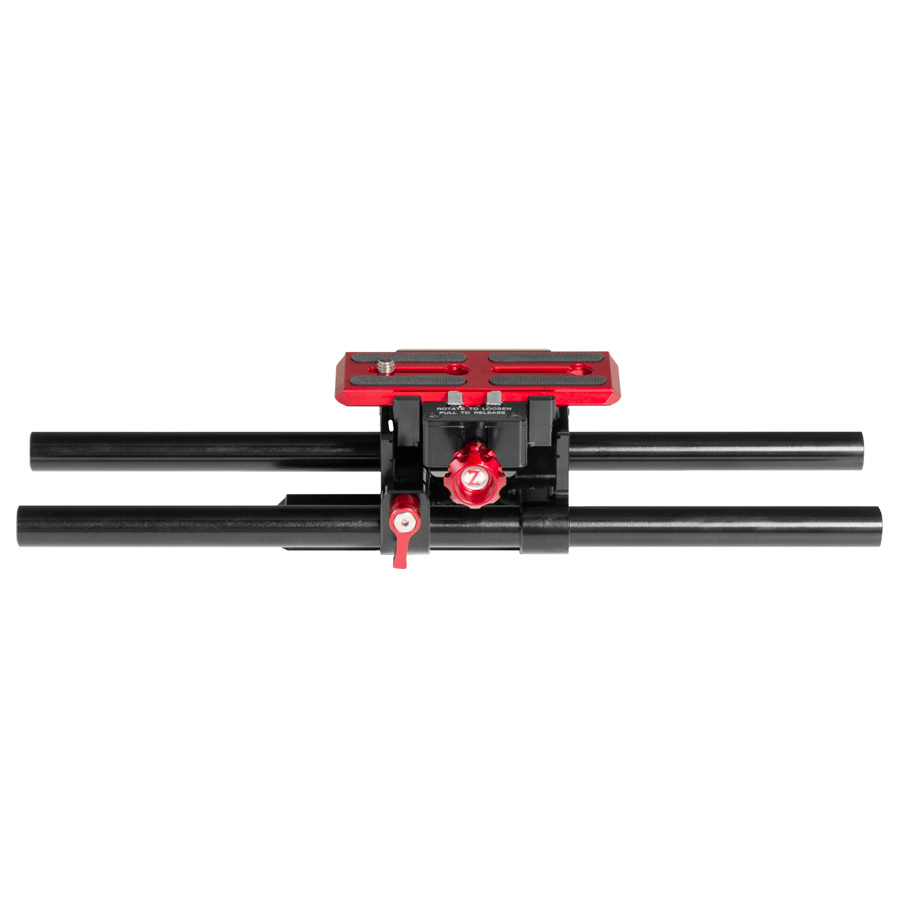 The Polaris Baseplate is Arca-Swiss compatible on the upper and lower camera side and on the tripod side (or Polaris shoulder pad side). The upper red camera plate is attached to the bottom of the camera with a 1/4" screw and is quickly detachable to slide off the baseplate with a twist and a push of a button, leaving the rods and baseplate behind. The Polaris Baseplate comes with two 12" rods.
