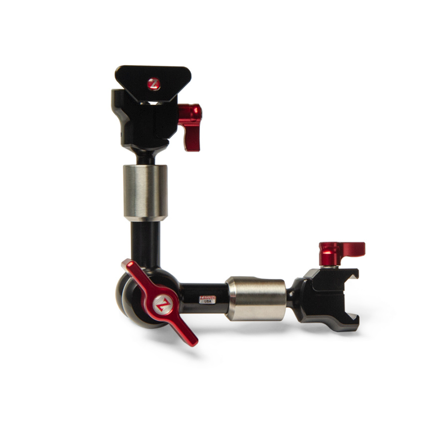 The Zamerican Z-Rail Arm is a 6" articulating arm with two Z-Rail clamps at both ends. It is attached to a 1/4" mounting point via the supplied Mini Z-Rail and holds monitor, light, recorder or the like reliably in position on the camera / rig. The arm has chrome balls for smooth movements. The central red knob controls the central pivot and the ball joints at both ends of the arm.