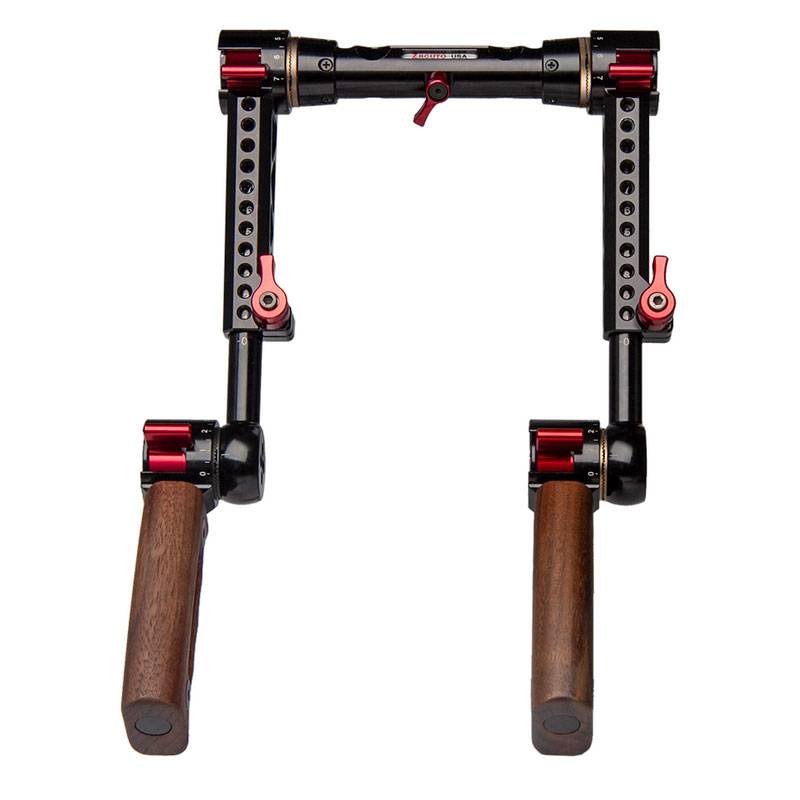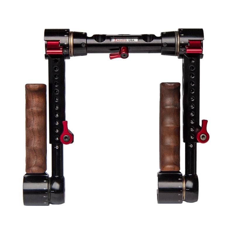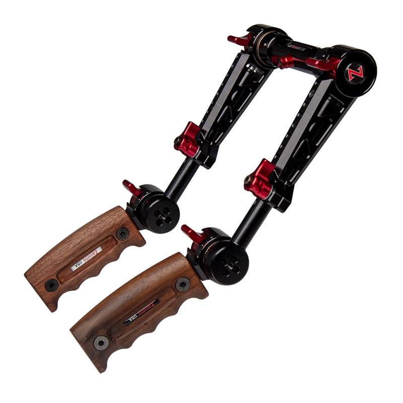 Our trigger grips are the most adjustable grips available. They allow for single-handed 360° rotation with the simple press of a trigger. The two handles rotate independently of each other. Flip them down for a low, rock-solid handgrip. Raise it up for more of an Aaton style position. Or quickly flip them both all the way up to set your camera flat on the ground or for storing in a case. Or stagger them if that is more comfortable to you. The length of the handgrips can also adjust by loosening a red lever and pulling the grip out or pushing in.
