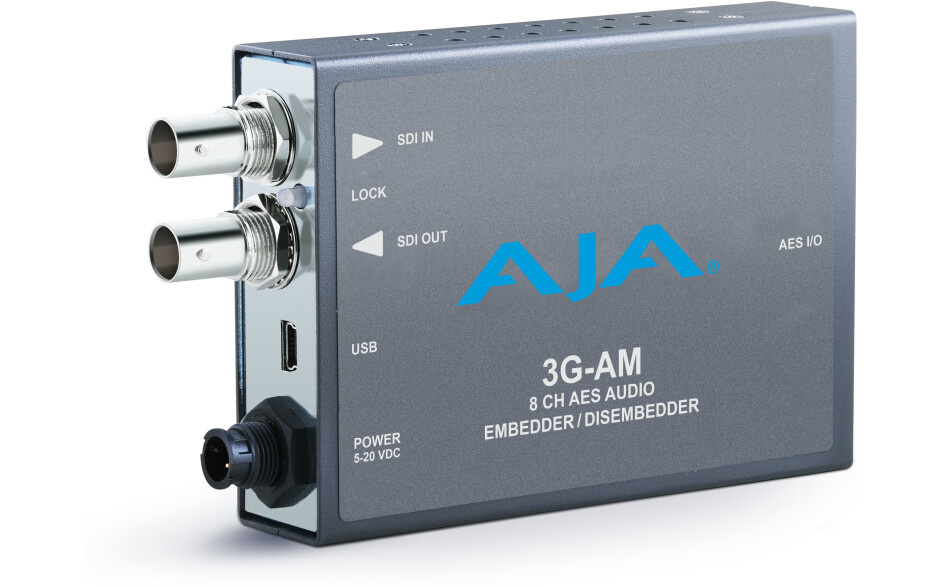 The 3G-AM from AJA is a triple rate 8-channel AES audio embedder/disembedder. AES audio can be embedded and disembedded simultaneously. The embedder is user selectable, on a channel pair basis, to either "pass" existing SDI input audio or embed AES input audio from the breakout cable. The ability to pass incoming ancillary data makes it possible to embed up to 16 channels of audio by cascading two units. Horizontal ancillary data (HANC) packets in compliance with SMPTE 291M can also be dropped at the input. The 3G-AM automatically detects and configures to the input video standard, and formats to a resolution of up to 2048 x 1080p. This unit includes an XLR connector AES breakout cable.