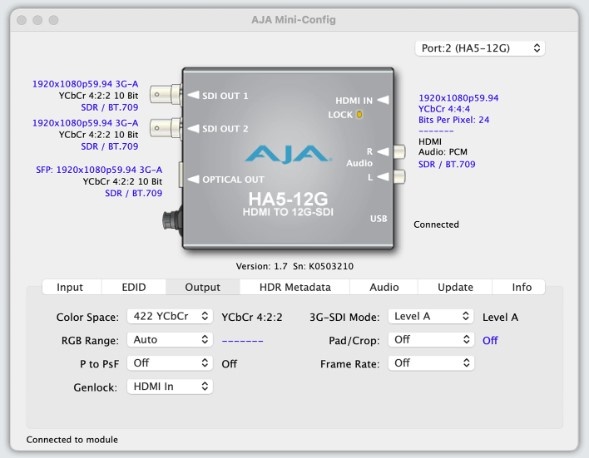 AJA’s free Mini-Config software can be used with any USB enabled AJA Mini-Converter and provides an easy to use graphical interface with detailed information about the current input and output formats. Control all the parameters of any supported AJA Mini-Converter as well as loading firmware updates from AJA that add new features and functionality.