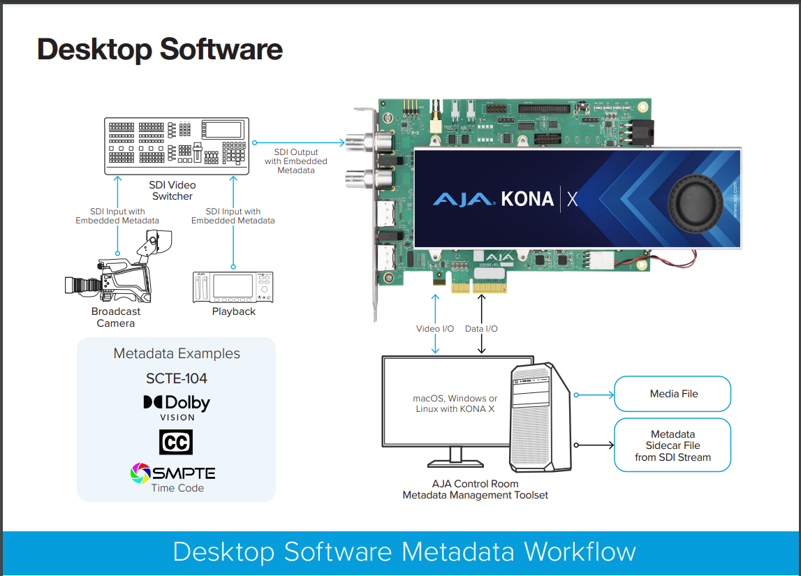 - Using an AJA KONA capture card that supports SDI input and the included AJA Control Room software (such as KONA 5 or KONA X), the card captures the metadata, which is then preserved in a metadata sidecar file.