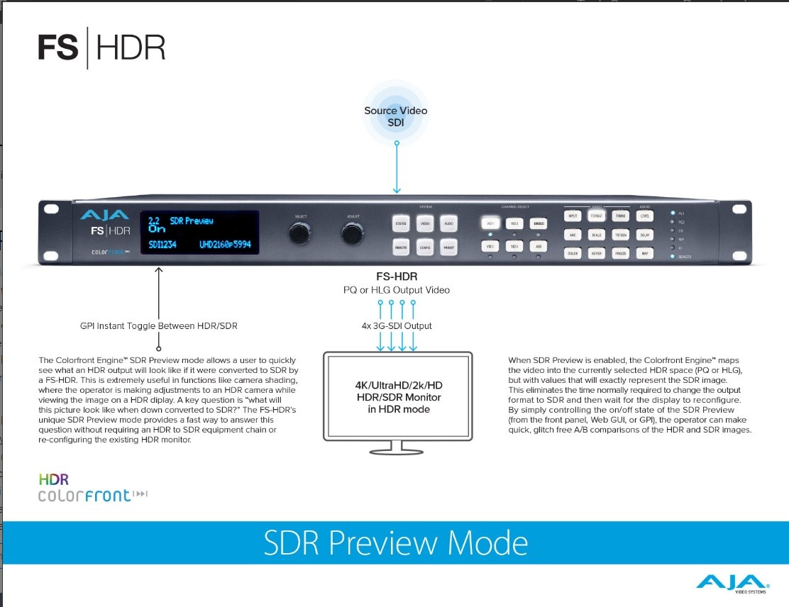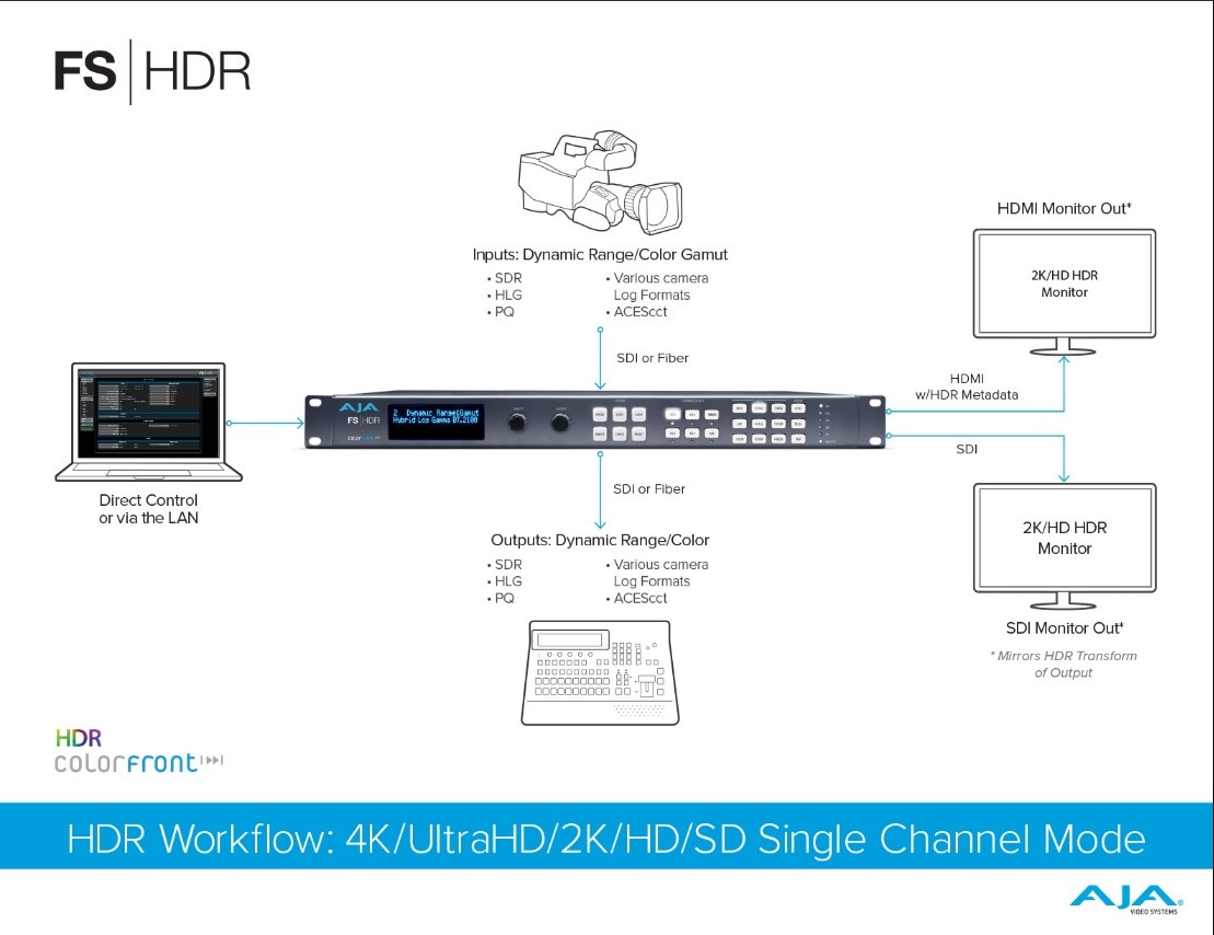 FS-HDR’s HDR/WCG capabilities leverage video and color space processing algorithms within the Colorfront Engine, specially licensed by AJA from Colorfront and developed by Colorfront’s CTO Bill Feightner and Lead Engineer Tamas Perlaki.