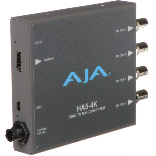 AJA’s HA5-4K Mini-Converter provides high-quality conversion of HDMI to 4K SDI with 4x 3G SDI outputs. HA5-4K allows conversion of HDMI video from DSLRs, mirrorless cameras, action cameras, or prosumer 4K video cameras to 4K SDI for use in professional workflows. HA5-4K is also capable of analyzing HDR infoframe data coming in over HDMI when used with AJA Mini-Config software.