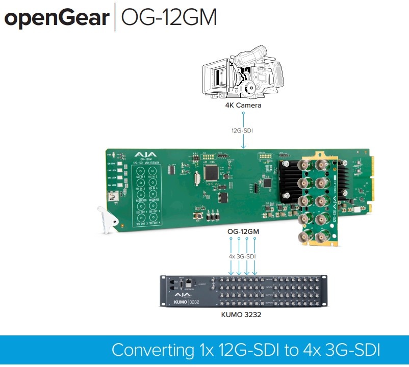 This workflow diagram shows a 4K camera system outputting video via 1x 12G-SDI connection. This output is connected to the 12G-SDI input of the OG-12GM, which then converts it into quad-link 3G-SDI, here shown with an AJA KUMO 3232 3G-SDI router providing further distribution.