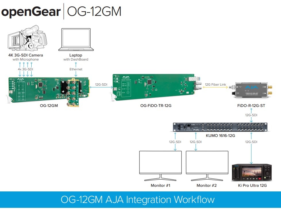This integration workflow diagram shows a 4K camera system outputting video via a 4x 3G-SDI quad-link connection. The OG-12GM provides a conversion from quad-link 3G-SDI into single link 12G-SDI, allowing the 4K 3G-SDI camera source to fit seamlessly into a 4K 12G-SDI eco system. Multiple OG-12GM cards can be housed in the appropriate openGear rackframe, making multi-cam conversions easy.