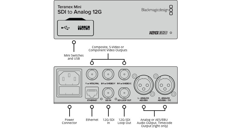 Convert from 12G-SDI to Analog, Use SD, HD, 6G and 12G-SDI rates and convert to analog video output, Built in down converter lets you connect Ultra HD sources to component video equipment in SD or HD, Allows you to connect analog equipment including Betacam SP, VHS, and video monitors,