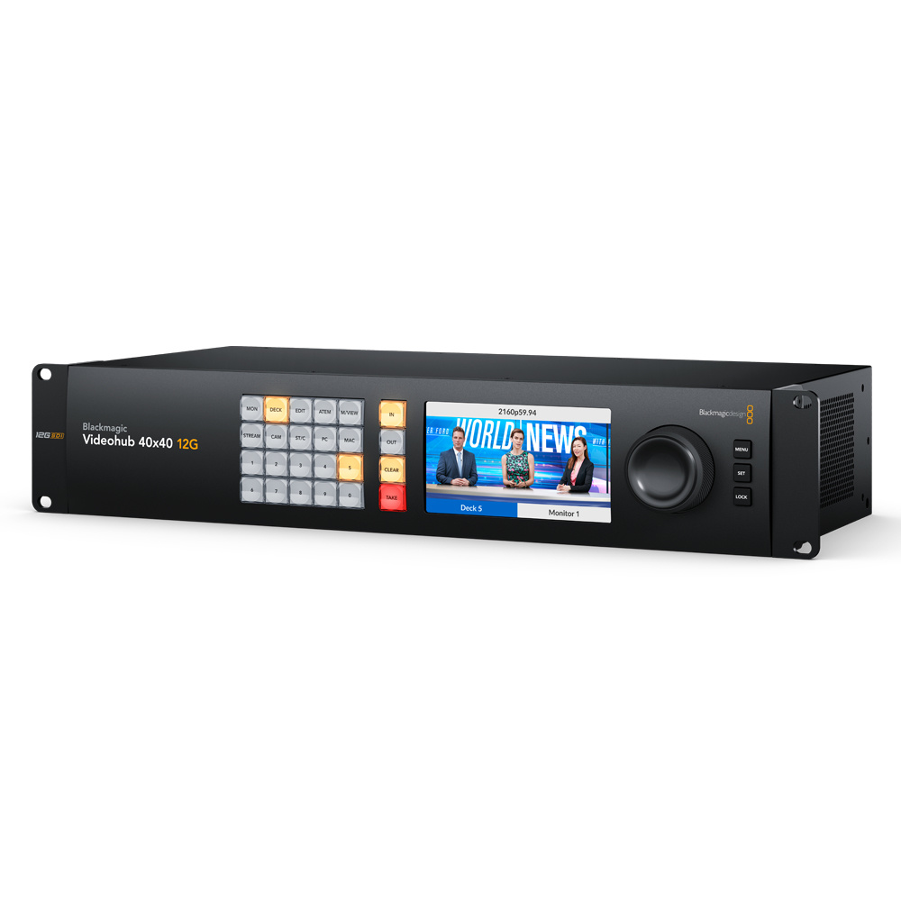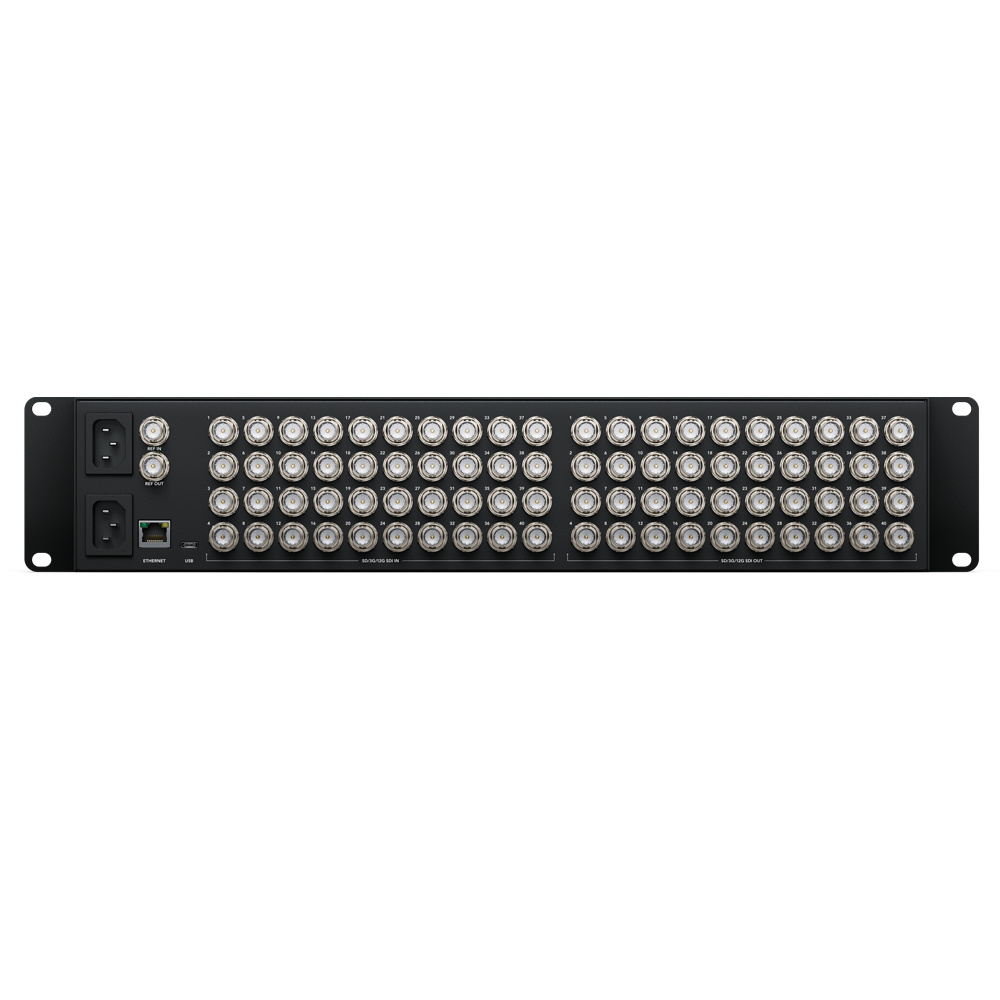 Blackmagic Videohub 40x40 12G is an advanced zero latency video router that supports any combination of SD, HD and Ultra HD on the router simultaneously, It has 40 12G-SDI inputs and 40 12G-SDI outputs, redundant power supply and reference connections in two rack unit format,
