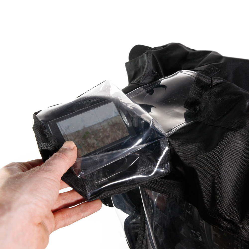 Multiple zip and Velcro openings provide easy access to all essential parts of the camera. From openings for Multi-Interface shoe connections, wireless antennas, microphone and viewfinder to a transparent window on the side for the LCD screen, this rain cover has it all. The transparent back of the case opens easily to change the camera battery or quickly access the cables.