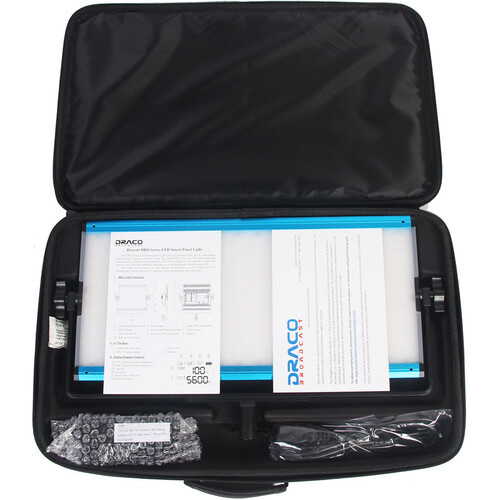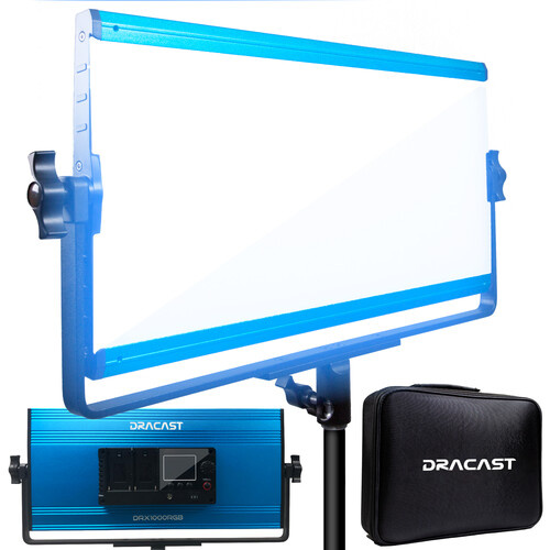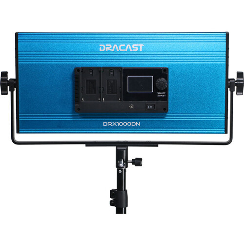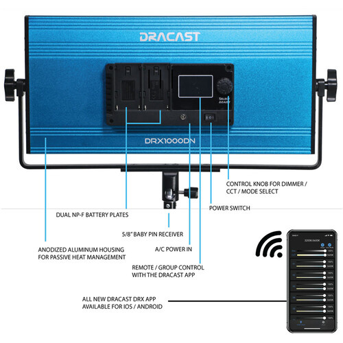 This 70W light can be adjusted manually via the control panel on the back of the fixture or by using the Dracast DRX app available for iOS and Android devices. The panel includes an installed mounting yoke with a 5/8" Baby Pin receiver for fast and easy mounting on compatible light stands or suspension clamps. The X Series 1000 can be used worldwide via the included 100 to 240 VAC adapter but it will also run on two optional NP-F-type batteries in situations where AC power is unavailable. A soft carry case is included for convenient storage and transport of the light.