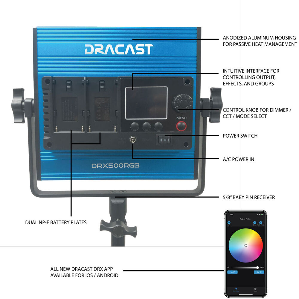 This 35W light can be controlled manually via the control panel on the back of the fixture or using the Dracast DRX app available for iOS and Android devices. The panel comes with a pre-installed mounting bracket with a 5/8” Baby Pin receiver for quick and easy mounting to compatible light stands or suspension clamps. The X Series 500 can be used worldwide with the included 100 to 240 VAC adapter, or with two optional NP-F type batteries for situations where AC power is not available. A soft carrying case is included for convenient storage and transport.