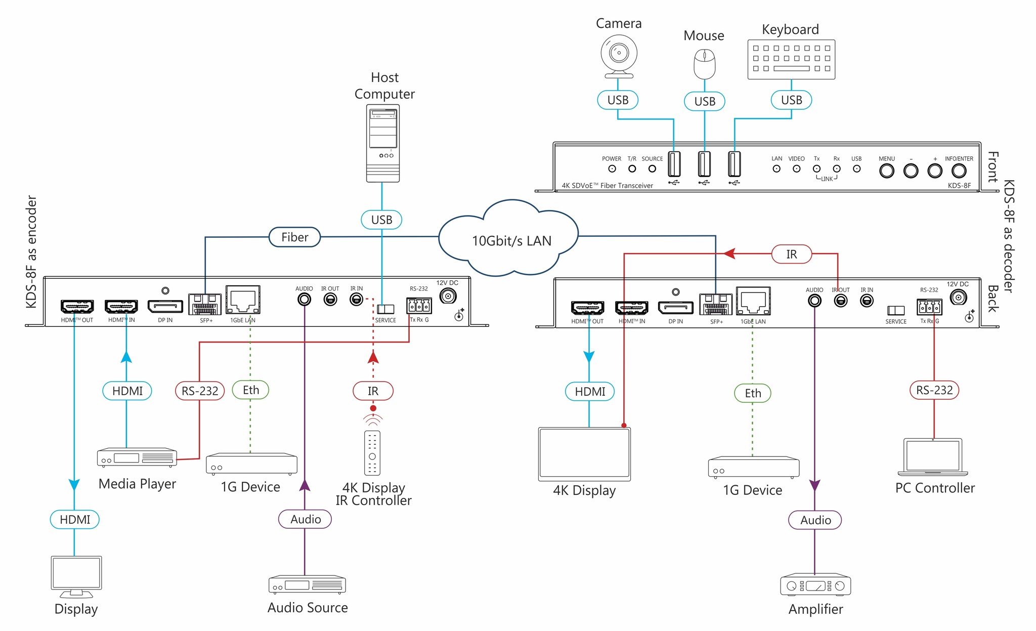 KDS−8F is a high−performance, zero latency, 4K@60Hz (4:4:4) video streaming transceiver for streaming via Ethernet over single−mode and multi−mode optical fiber. KDS−8F can be set as either an encoder or decoder. As an encoder, it encodes and streams the HDMI or DisplayPort input along with IR, RS−232, analog audio and USB, over an IP network. As a decoder, it receives the encoded signal and decodes it for output.