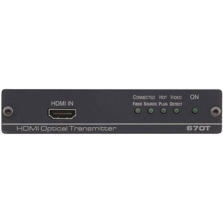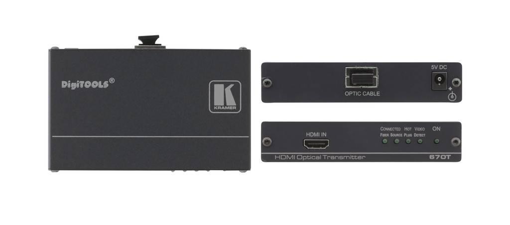 The Kramer 670T Fiber Optic Transmitter converts an HDMI signal to light pulses and transmits it to the 670R receiver over a single fiber optic cable. When coupled with a 670R Receiver, the 670T Fiber Optic Transmitter allows transmission of 4 TMDS video channels and 1 low-speed channel via multimode fiber optic OM3 cable for passing HDCP, EDID, and HPD (Hot Plug Detect) signals.