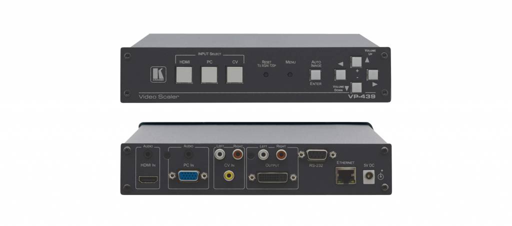 The VP−439 is a high−performance digital scaler for computer graphics video, composite and HDMI signals, including audio. It up/down scales the selected HDMI, CV or computer graphics video/YPbPr input and outputs it to HDMI on a DVI−I connector.