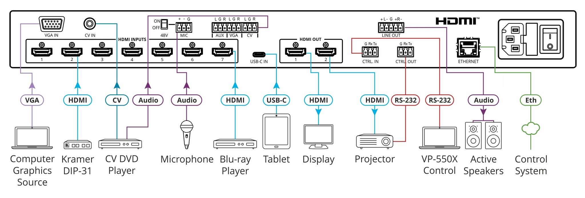 - 4K and Legacy Inputs — 7 HDMI and 1 USB–C 4K@60 (4:4:4) inputs, 1 VGA input, and 1 CV (composite video) input.