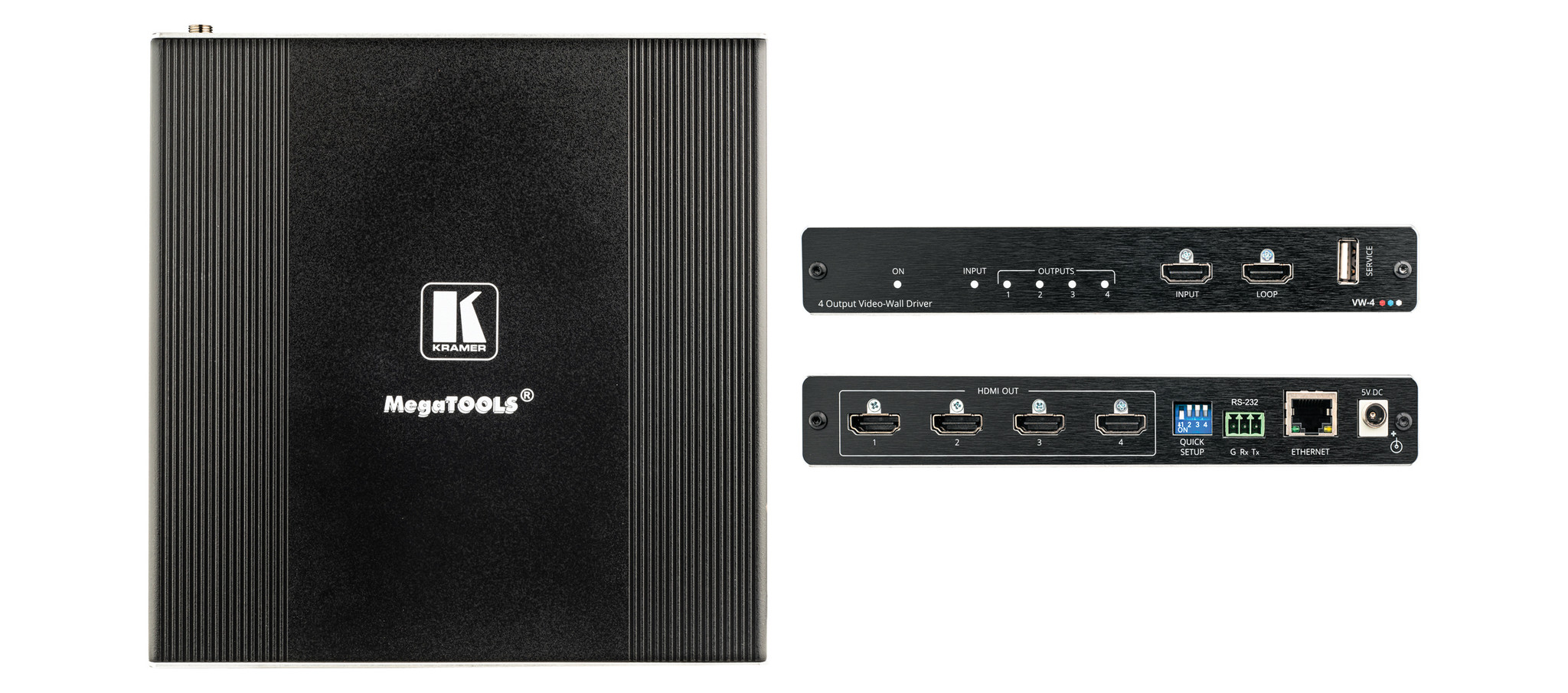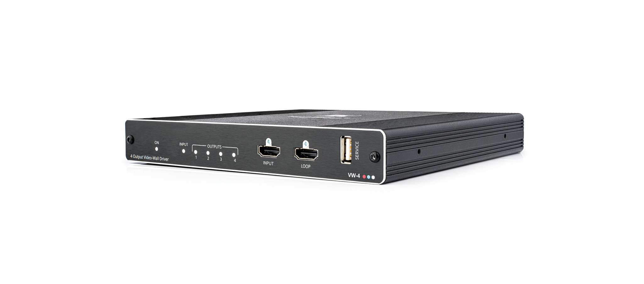 VW−4 is a 4−output video wall driver designed to quickly and easily configure and manage video walls. Use one VW−4 device to create any wall configuration with up to 4 displays, for example, a 2x2, 4x1, 1x4, 2x1, 3x1 video wall. Connect additional devices to create walls of any size and configuration of up to 64 displays. Configure a single or multiple device setup using the VW−4 app via Ethernet or RS−232, or quickly configure a basic setup using the local dip switches.