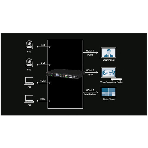 This integrated solution supports presentation/performance/special event venues, corporate AV conferences, and classrooms for e-learning. The XS-62S is a 1 RU unit with front panel control buttons and a menu screen. It can also be controlled from a Windows PC or Mac using the real-time remote control software.